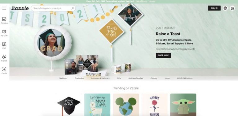 Zazzle is an amazing site for selling print-on-demand items, as the number of product options that you can find on it is plentiful. With the help of the Live feature, you can instantly connect on video chat with a design expert who can help perfect your design for free.