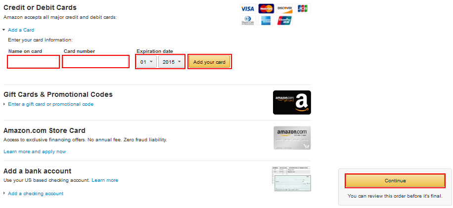 When you’re done, this credit card will automatically be selected as a payment option, so you can just click Continue.