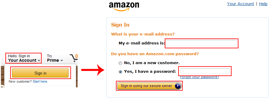 Go to www.amazon.com in your web browser and log in. To do this, move your mouse over “Hello, Sign In” and click Sign In. Then click in the boxes highlighted in the right screenshot below and type in your email address and account password, respectively. Finally, click Sign In Using Our Secure Server.