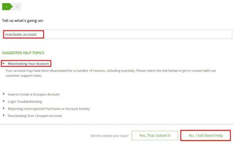 Once you’re in Groupon’s help wizard, click in the box marked “Tell Us What’s Going On” and type “reactivate account” (or something to that effect). You should get a suggestion titled Reactivating Your Account.