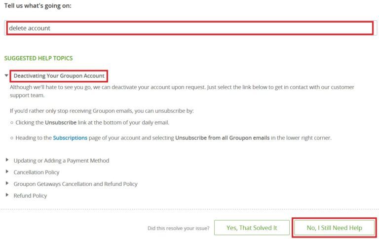 Groupon will give you some suggestions on what you might want to do instead of deleting your account, such as unsubscribing from Groupon’s emails or deleting payment options from your Groupon account. If you still want Groupon to delete your account, click No, I Still Need Help instead.