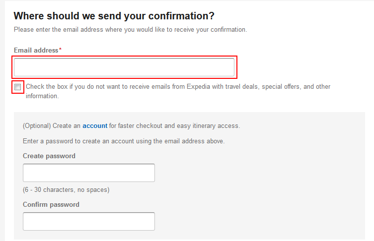7. The final thing to do is tell Expedia where you want the booking confirmation sent. Click in the box labelled “Email Address” and type in the email address that you want your booking confirmation sent . You can also click the check box here if you don’t want Expedia sending you additional offers.