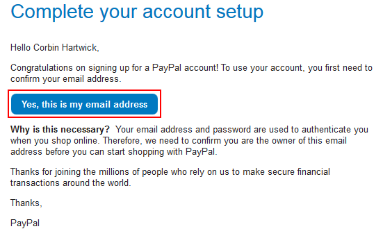 There’s one more thing that you need to do to complete the setup of your account, and that’s verify your email address. You can’t use your PayPal account without doing so! Go to your email client and log in. Find the email from PayPal Service titled “Welcome to PayPal” and click on it to open it. From there, just click the blue Yes, This is My Email Address button in the email.