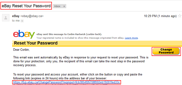 Go to your email provider and log into your account. Then, open the email from eBay titled “eBay Reset Your Password.” Click either the Change Password button or the blue hyperlink inside the email.