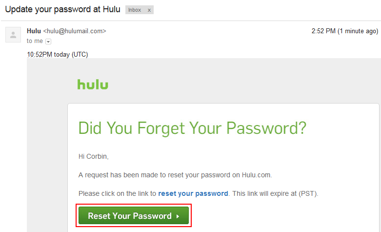 Hulu will send you an email that contains a hyperlink that you can use to reset your password.