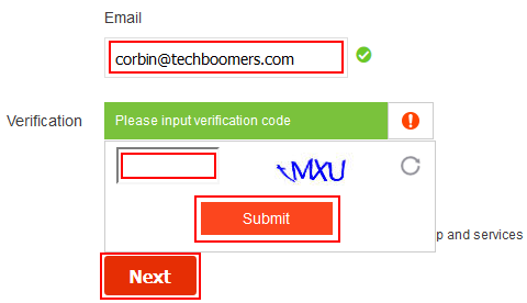 - Enter your email address, complete the security test (use the slider, type the letters, and click Submit), and click Next.