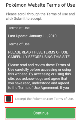 6. Next, scroll to the bottom of the screen and tap the check box there to say that you agree to the rules of using the official Pokémon website and its associated functions. Then tap Continue.