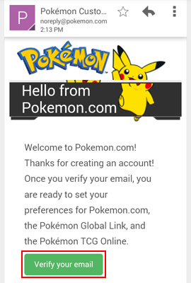 8. The last step is to verify your email address. Go to your email client, log in, and find the email from Pokémon Customer Service titled "Pokémon Trainer Club Activation". Click or tap it to open it, and then click or tap the Verify Your Email button. There! You're all set with a Pokémon Trainer Club account!
