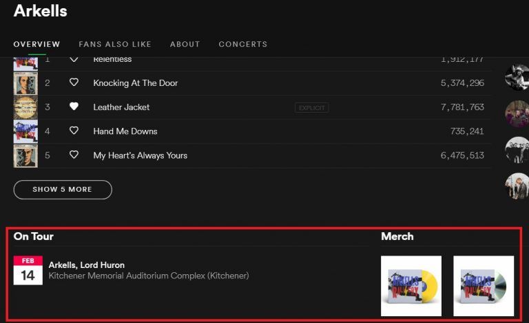 You can also view upcoming concerts from that artist – including date, time, location, and details on the band lineup – and even quick-jump to an authorized retailer to get tickets. Artists may also sometimes have premium merchandise advertised, such as apparel or special edition albums, and Spotify can direct you to where to shop for it.