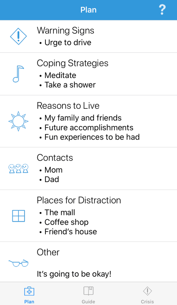 Suicide Safety Plan helps users cope and stay safe when they’re experiencing suicidal thoughts. The app allows users to program useful information, including personal warning signs, coping strategies, contacts, and more. It also allows users to easily contact help and provides them with educational resources to help them make the most of their safety plan.