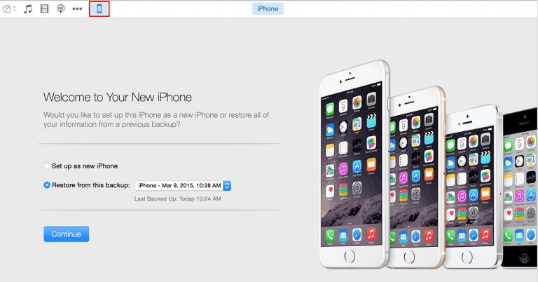 Then plug your old iPhone into your computer. You’ll see an iPhone icon appear at the top of the iTunes window. Click it to access your iPhone’s details page.