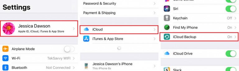 Then, navigate to your iCloud settings by tapping your name, then iCloud, then iCloud backup.