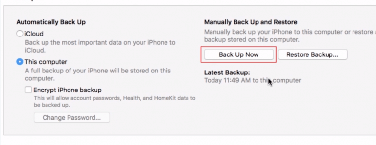 In the “Backups” section of the iTunes window, click Back Up Now.