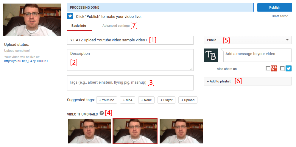 4. You will have to wait for your video to upload and process before you can publish it. In the meantime, you can fill out some basic information about the video. We’ve marked important areas on the screenshot below with red numbers; the corresponding captions below the screenshot have more information on what you can do at each point.